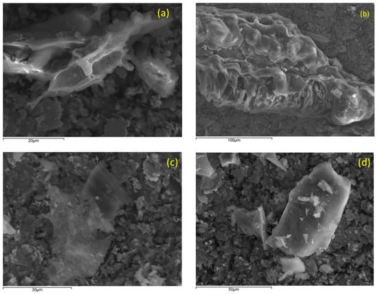 Scanning electron microscopy (SEM) images of the prepared biochars; (a) RHB400, (b) RHB550, (c) RHB700 and (d) RHB850.
