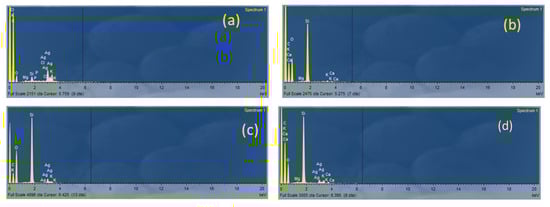 Energy-dispersive X-ray spectroscopy (EDX) analysis of the prepared biochars; (a) RHB400, (b) RHB550, (c) RHB700 and (d) RHB850.
