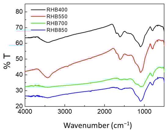 The Fourier-transform infrared (FTIR) spectra of the biochars are presented in Figure 3. Generally, there are 5 peaks and their intensity change with the pyrolysis temperature. The peak at about 3400 cm−1 is due to –OH groups and adsorbed water molecules []. This peak is less intense with the temperature, due to the greater extent of burning, pointing out the removal of O containing species during pyrolysis, in accordance with the EDX results. This peak is closely related to the one at 1090 cm−1, due to the symmetric C–O stretching. The peak at 1712 cm−1, due to C=O groups also depends on the preparation conditions []. At higher temperatures this peak can hardly be observed due to the formation of volatile oxygen species and removal of O species. The peak at about 1600 cm−1 can be attributed to C=C groups, while the absence of any peaks above 3000 cm−1, due to the –C–H stretching, is an evidence of the absence of aromatic H, pointing out an aromatic phase poor in hydrogen [,]. Finally, the low intensity of the peaks in the region of 1000–1800 cm−1 for the RHB700 and RHB850 is characteristic of the heterogeneity of these biochars, probably due to the high content of minerals [].