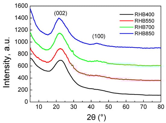 The X-ray diffraction (XRD) patterns of the biochars studied are presented in Figure 4. There are two broad peaks, characteristic of amorphous carbon forms, centered at about 22° and 43.3°. The first peak can be assigned to (002), while the second to (100) crystal planes of hard carbon in lignocellulose form [,].