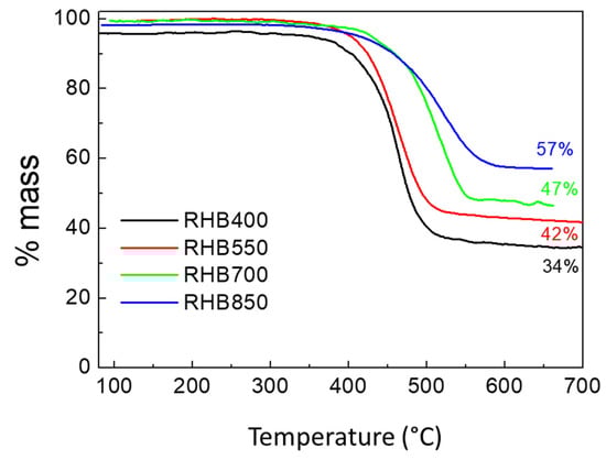 At the beginning of the thermal treatment an isothermal step for 1 min in 80 °C was applied, to remove the adsorbed water. For all the biochars there is a small mass loss, due to adsorbed water, which is higher for the RHB400. During thermal treatment a sharp decrease in the mass was observed for all the samples, resulting in the burn of the organic phase and the removal of C. Interestingly, the temperature where the decomposition occurs increases with the pyrolysis temperature. This clearly shows that burning the carbonaceous phase requires a higher amount of heat since higher pyrolysis temperatures transform the carbonaceous phase to hard carbon. This was also observed in different biochars after treatment with acid or base solution, where the carbonaceous phase was different after treatment and exhibits differences in the burning temperature []. The amount of the minerals can be estimated by the mass left in TGA run. The RHB850 sample has more than half of its weight minerals, while the RHB400 has 34%. Since higher pyrolysis temperatures results in increased removal of organic phase this is expected. The mass of the minerals left after TGA run is reported in Table 2.