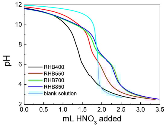 Potentriometric titration curves for the rice husk (RH) biochars and the blank solution.