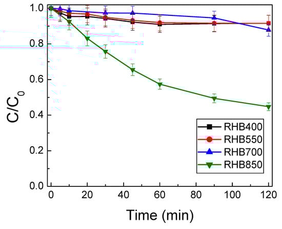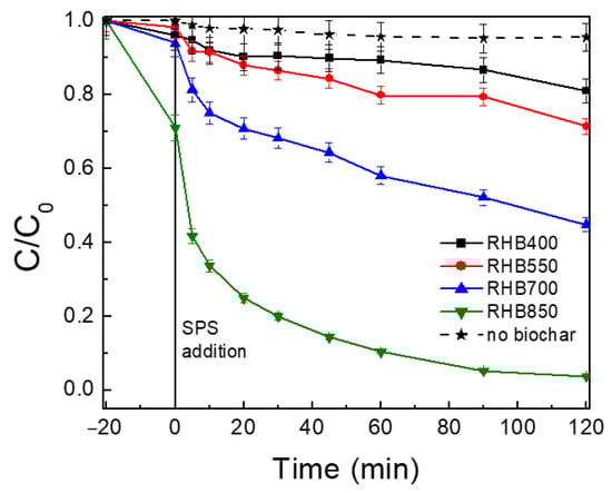 As can be observed in Figure 7, the efficiency of SMX degradation is defined to a great extent by the kind of biochar used in the process, and thus from pyrolysis temperature. The general tendency is that catalytic reactivity increases as pyrolysis temperature increases, in the range that was examined (400–850 °C). Biochars produced by pyrolysis of RH up to 400 °C or 550 °C showed insufficient activation of SPS, reaching 19% and 29% removal of the pollutant, respectively, after 120 min, when using 100 mg/L biochar and 500 mg/L SPS in ultrapure water (UPW) and inherent pH. On the contrary, biochars produced by pyrolysis of RH up to 700 °C or 850 °C showed interesting results, reaching 55% and 96% SMX removal, respectively, after 120 min. It is to be noted that SMX removal surpassed 90% after 60 min in the case of RHB 850.