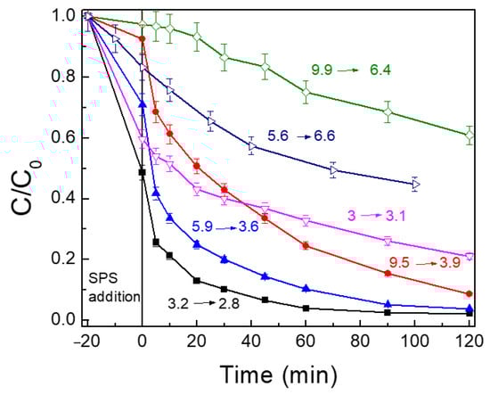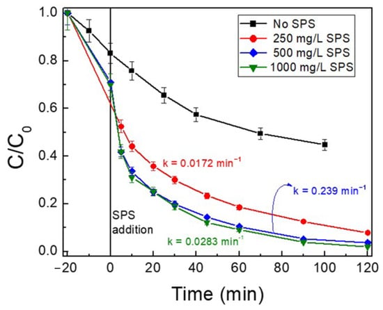 The influence of SPS concentration is presented in Figure 9. With no SPS the removal of SMX is due to adsorption alone. The adsorption is significant and about 55% after 120 min. The addition of SPS increases the degradation of SMX and it was found that after 60 min almost complete removal of SMX occurs with 500 mg L−1 SPS. The logarithms of C/C0, shown in Figure 9 have a very good linear correlation with time, confirming the pseudo–first order kinetic. More details about the kinetic analysis can be found in []. The apparent kinetic constants (kapp) computed from the slopes of the respective tendency lines, show an increase with the SPS concentration up to 500 mg/L and a plateau above this concentration. This is an evidance that SPS activation occurs on the surface sites of the biochar.