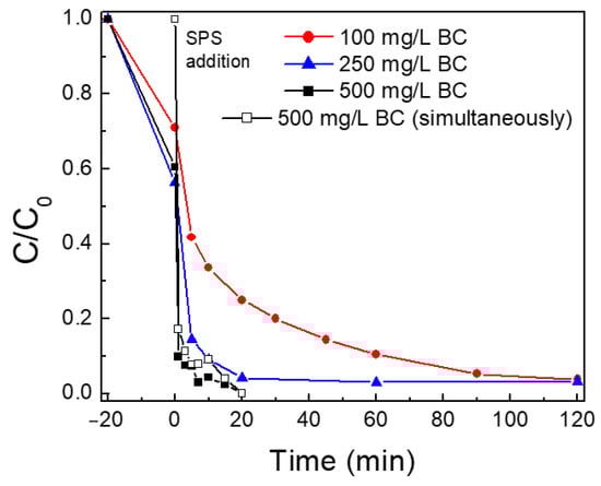 For RHB850, the kapp values were computed equal to 2.39 × 10−2 (100 mg/L biochar) 4.53 × 10−2 (200 mg/L biochar) and 1.42 × 10−1 min−1 (500 mg/L biochar), i.e., a five-fold increase in biochar concentration resulted in a six-fold increase in the rate constant. These results agree with the use of biochar from olive stones as catalyst []. Interestingly, the application of 500 mg/L RHB850 can almost eliminate the SMX in a very short treatment time (about 10 min). The main process for the removal of SMX is the degradation process since the same results were also obtained in the case that SPS and RHB850 were simultaneously added to the SMX solution. In this case there was a sharp decrease of the SMX concentration of 83% in the first minute, while more than 92% of the SMX had been removed after 5 min. This was in agreement with the kinetics curves of the activation of SPS []. These curves show that only a small portion of SPS consumed by the biochar with the first 10 min and then the concentration of SPS remains constant with time [].