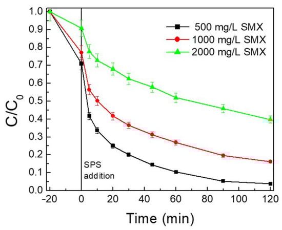 Effect of SPS concentration on 500 μg/L SMX degradation with 100 mg/L biochar (RHB 850) in UPW and pH = 5.6.