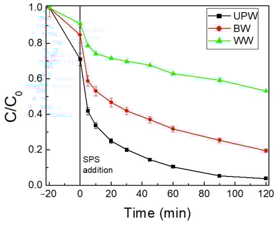 Effect of water matrix on 500 mg/L SMX degradation with 100 mg/L biochar (RHB 850) and 500 mg/L SPS at pH = 5.6.