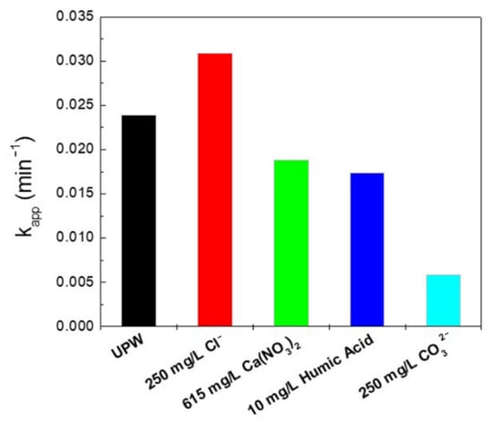 We tried to find out the components that have detrimental effect on the SMX degradation experiments using spiked solutions with various non–target species, namely, bicarbonate, chloride and humic acid. To compare the results we used the kapp values and the results are summarized in Figure 13. The most severe inhibition was from bicarbonate ions leading to only 24% removal compared to the experiment without bicarbonates. This can be attributed either to scavenging action of bicarbonates or to the competitive adsorption of these anions on the biochar surface. The latter can influence the electron transfer pathway since it is known that the first step in this pathway is the adsorption of persulfates on the biochar surface [].