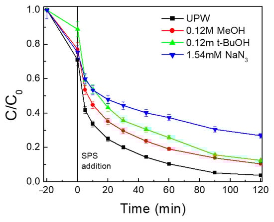 The addition of methanol or t–butanol (0.12 mol/L), well known radical scavengers, were used to check the contribution of free radicals in the degradation process. Methanol reacts with both sulfate and hydroxyl radicals at similar rates, while t–butanol reacts preferentially with hydroxyl radicals [,]. Also, the addition of sodium azide, a well-known scavenging factor of the singlet oxygen reactions, was tried []. As can be seen in Figure 15, SMX degradation is slightly impeded by either alcohol, but strongly decelerated by sodium azide, the kapp decreases from 2.39 × 10−2 min−1 for UPW to 1.62 × 10−2, 1.54 × 10−2 and 8.6 × 10−3 min−1 for methanol, t–butanol and sodium azide, respectively.