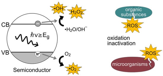 Hence, there is an increasing interest in using photocatalytic systems as nanocoatings to disinfect surfaces, air, and water []. Photoactive agents such as titanium dioxide (TiO2) loaded with metallic co-catalysts have been tested in many applications, including the removal of organic contaminants []. This technology relies on the production of reactive oxidative species (ROS) such as hydroxyl radicals, superoxide radical ions, and hydrogen peroxide (H2O2) in response to light excitation with energy greater than the band gap of the photoactive catalyst (see Figure 1).