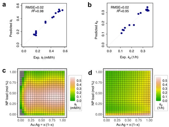 Pair-wise comparison of the accuracy between the experimental observation of H2O2 (a) production rate and (b) decomposition rate as function of the AuxAg(1–x) co-catalyst nanoparticle composition and nanoparticle loading (mol %) within TiO2. Heatmap of predicted reaction rate by GAM for (c) and (d) .