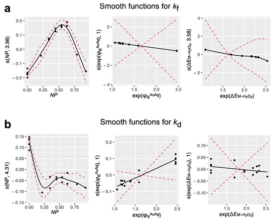 The smooth functions (see Figure 3) depict the relationship between the (and ) and the input variables. The degrees of freedom for the smooth functions with respect to nanoparticle loading are higher compared to those for and . This fact confirms our initially assumed non-linear impact of nanoparticle loading on the H2O2 production rates and explains why GLM performed poorly as shown earlier. Thus, GAM models reproduce well both rates and capture their non-linear dependence on the input variables.