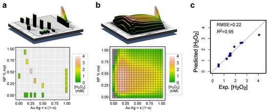 Figure 4c reports the RMSE and of the predicted vs. real data of the H2O2 production that achieves high accuracies in individual predictions between the observed and produced H2O2 concentrations as indicated by , while the RMSE is as low as 0.22 mM. Therefore, the GAM models we built can capture the main trends governing [H2O2] as a function of the properties of the metallic co-catalyst concentration in the AuxAgy/TiO2 system.