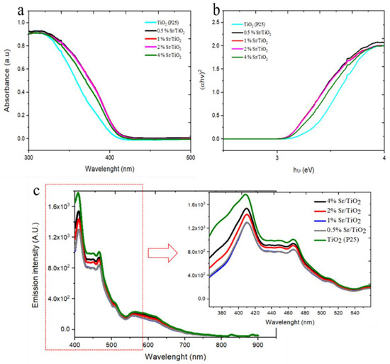 (a) UV-vis absorption spectra; (b) Tauc plots from UV-vis absorption spectra of TiO2 and Sr-doped TiO2; and (c) PL spectra of TiO2 and Sr-doped TiO2 photocatalysts (excitation wavelength = 320 nm).