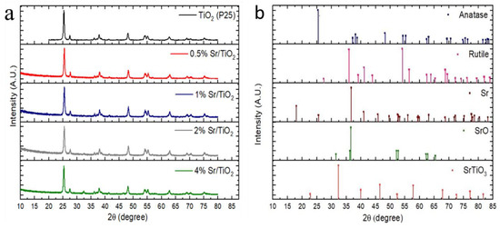 It was found that Sr-doped TiO2 samples show relatively wider anatase (101) 2θ (see Table 1), implying smaller crystallite sizes compared with pristine TiO2 as shown in [25,26]. The decreases in crystallite sizes of Sr-doped TiO2 indicates that the Sr can penetrate the TiO2 structure, forming some oxide forms (as found in XRD results), but anatase could still be formed, which is beneficial for the photocatalytic applications.