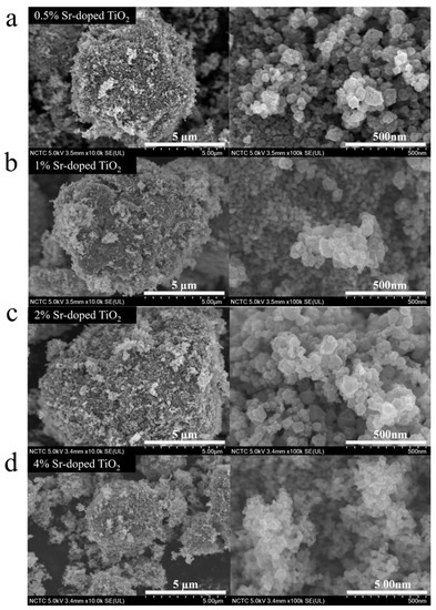FE-SEM images at low (left side) and high (right side) magnifications of (a) 0.5% Sr-doped TiO2; (b) 1% Sr-doped TiO2; (c) 2% Sr-doped TiO2; (d) 4% Sr-doped TiO2.