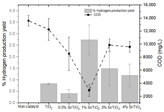 It was found that 1% Sr-doped TiO2 presented the highest H2 production yield (2.7%) which is significantly higher than the pristine TiO2 with the lowest COD value (reduction from 14,400 to 2400 mg/L). The result of 1% Sr-doped TiO2 may best describe the properties of Sr-doped TiO2, which can markedly improve the separation of charge carriers (according to PL spectra), resulting in higher photocatalytic efficiency [14].