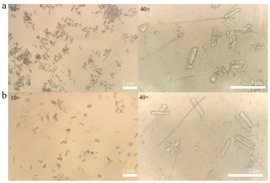 Microscopy images (at 10 × and 40 × magnifications) of struvite crystals formed from synthetic urines (a) before and (b) after the photocatalytic process (using 1% Sr-doped TiO2 photocatalyst).