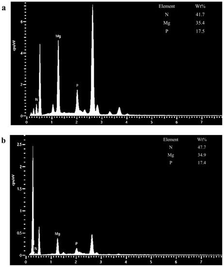 EDS spectra of struvite crystals formed from synthetic urines (a) before and (b) after the photocatalytic process (using 1% Sr-doped TiO2 photocatalyst).