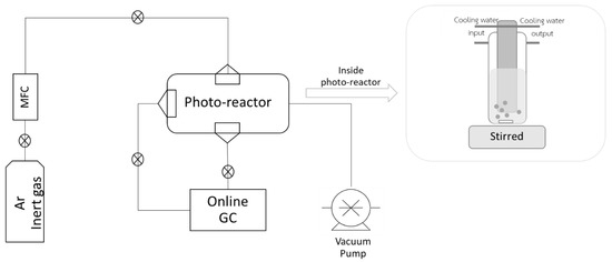 Titanium (IV) dioxide (TiO2) nanopowder (anatase phase, particle size <25 nm, 99.7% trace metals basis, Aldrich Chemistry (Darmstadt, Germany)) and strontium nitrate (ACS reagent, ≥99.0% (Sr (NO3)2), Sigma-Aldrich (Darmstadt, Germany)) were purchased. Methanol from RCI Labscan (Bangkok, Thailand) was added as an electron donor. N2 (99.995%) was used as the gas during the calcination of photocatalysts. Ar (99.995%) was used as the purge gas in the photocatalytic reactor. H2 (99.99999%) was used as the standard gas in gas chromatography (GC).