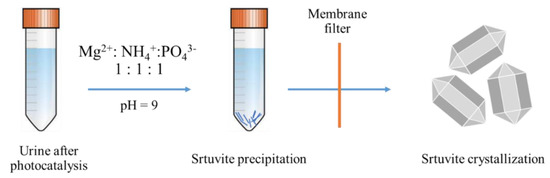 Liquid samples of synthetic urine after the photocatalytic process were collected for struvite precipitation (Figure 8). The suitable pH conditions for struvite crystallization are 7.5–9.0 [31]. Therefore, pH 9 was selected for this experiment. NaOH (15%) was added to the sample solution for the increase in pH value [32]. MgCl2 was added as an Mg source to the solution for adjustment of the molar ratio of Mg:P of 1:1 [29]. Struvite crystals were spontaneously precipitated. The samples were collected and characterized using a light microscope (Nikon Eclipse E200, Tokyo, Japan) and FE-SEM (SU5000 Hitachi, Tokyo, Japan) for the determination of morphologies and structures of the struvite crystals from the synthetic urine. Before morphology characterization, the samples were filtered by a Pall Supor®-450 (0.45 μm) membrane filter and dried in an oven at 105 °C for 1 h [29].