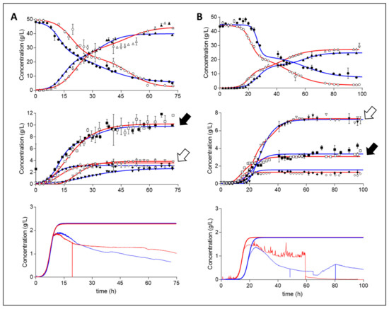 Repeat batch concentration profiles (g/L) of A. succinogenes on media (A) and media (B). Legend: dextrose (Dex), ◯; succinic acid (Suc), △; acetic acid (Ace), ☐; formic acid (For), ◇; pyruvic acid (Pyr), σ; repeats are indicated as filled shapes with blue fits. Biomass profiles (bottom) display online OD660 absorbance data and their logistic fits, with the top parameter fixed to a final DCW determined concentration. Black arrows (acetic acid) and white arrows (pyruvic acid) highlight the shift in their relative abundance between the two media.