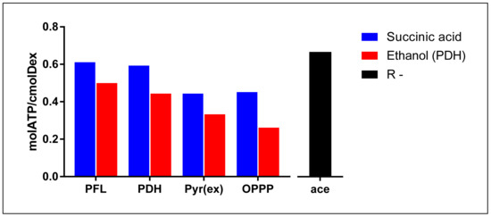 A quick glance at energy limitations highlights why succinic acid is favoured above ethanol production. When combined with the PFL redox producing route (Equation (2)) an amount of 0.5 mol ATP/cmolDex is extracted (Figure 4). This covers only 82% of the energy gained when succinate production is the redox consuming branch. Likewise, the PDH, Pyruvate excretion, and OPPP redox producing routes, when coupled with ethanol production via the PFL route, results in 75% (0.444 mol ATP/cmol Dex), 75% (0.333 mol ATP/cmol Dex), and 58% (0.262 mol ATP/cmol Dex) of the energy that would have been gained if succinic acid had been the redox consuming compliment, respectively (Figure 4). Ethanol may also be produced as a redox neutral product when produced via the PDH route (Equation (8)).