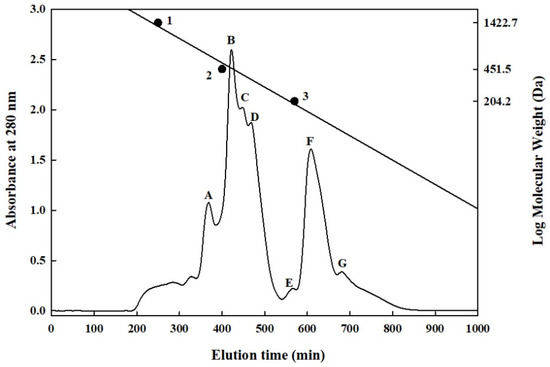Gel filtration chromatography of S. platensis protein hydrolysate was performed using the methods of Chen et al. [14] and Lin et al. [51], with slight modifications. The freeze-dried hydrolysate (HHP-FH-PR6G) with the highest HMGR-inhibiting activity was purified and separated using gel filtration chromatography (Sephadex G-25 column, 1.6 × 90 cm; Amersham Pharmacia Biotech AB, Uppsala, Sweden) and equilibrated with 0.02% deionised aqueous solution containing NaN3. The HHP-FH-PR6G powder was prepared at a concentration of 25 mg/mL. After passage through a filter membrane (molecular weight 5000 Da), 5 mL of the filtrate obtained was used as the injection volume; the 0.02% deionised aqueous solution was used as the eluent, and the flow rate of the peristaltic pump (Gilson MP1/LF, Gillson Medical Electronics, Villiers-le-Bel, France) was maintained at 0.5 mL/min. The eluate (5 mL/tube) was collected using a fraction collector (FC203B, Gillson Medical Electronics), and its absorbance was measured at 280 nm. Finally, the elution time and absorbance value were plotted as the horizontal and vertical axes, respectively, and standard calibration curve derived from the standard materials was converted into molecular weight of the sample. The standard materials and their molecular weights were as follows: bacitracin: 1422.0 Da; glycine-glycine-tyrosine-arginine: 451.5 Da; and tryptophan: 204.2 Da.