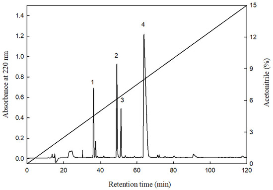 An elution profile of the fraction D from Figure 1 by reversed-phase HPLC. C18 Column: Synergi 4 μm Hydro-RP 80A (10 × 250 mm; particle size, 4 μm; Phenomenex, Torrance, CA, USA); elution A (deionized water containing 0.1% trifluoroacetic acid (TFA) and B (100% acetonitrile containing 0.1% TFA); mobile phase: linear gradient from 0 to 15% of B within 120 min; and flow rate of 1.0 mL/min at room temperature, and detection at 220 nm.
