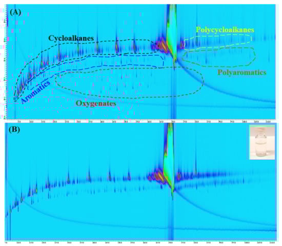 GC × GC chromatogram of reaction products: (A) classification of different compounds; (B) reaction over NiMoS/Al2O3 catalyst; inset shows an image of the liquid product.