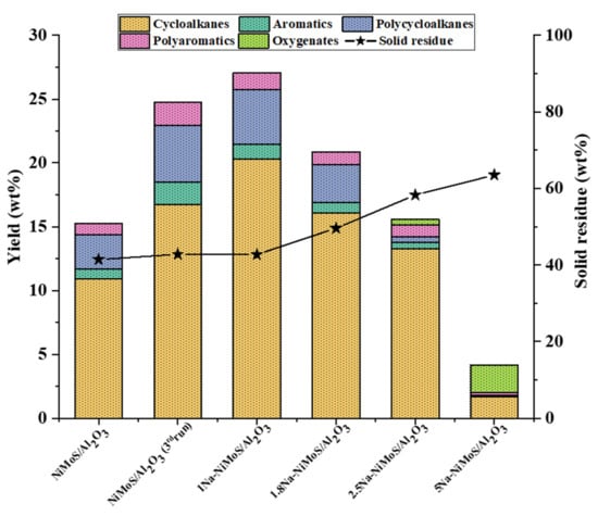 An additional increase in the Na amount to 5 wt% on the catalyst (5Na–NiMoS/Al2O3) significantly reduced the cycloalkanes yield to merely 1.7 wt% and the aromatics yield to 0.13 wt% (Figure 2). In contrast, the oxygenates yield increased to 2.2 wt%.