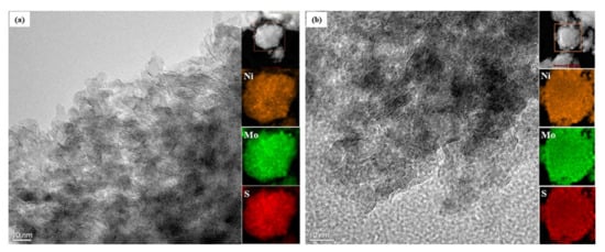HRTEM images showing the MoS2 fringes and the elemental distribution of NiMoS/Al2O3: (a) fresh and (b) after the 3rd consecutive run.