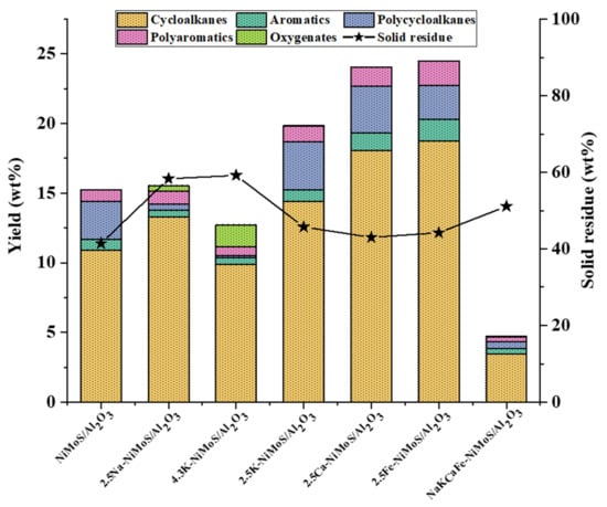Over the 2.5K–NiMoS/Al2O3 catalyst, a higher yield of cycloalkanes and aromatics, 14.4 wt% and 0.80 wt%, respectively, as compared to 2.5Na–NiMoS/Al2O3 was obtained (Figure 4). These yields were 1.1 wt% and 0.34 wt% higher than the 2.5Na–NiMoS/Al2O3 catalyst. The 2.5Ca–NiMoS/Al2O3 catalyst also showed an increase in cycloalkanes and aromatics yields (an increase of 4.8 wt% and 0.84 wt%, respectively, for cycloalkanes and aromatics) as compared to 2.5Na–NiMoS/Al2O3 (Figure 4). The 2.5Fe–NiMoS/Al2O3 catalyst likewise gave a 5.5 wt% increase in cycloalkanes yield and 1.1 wt% increase in aromatics yield as compared to the 2.5Na–NiMoS/Al2O3 catalyst. These yields were higher than the catalyst without any impurities (NiMoS/Al2O3), further confirming the promotor effect of K, Ca, and Fe. No oxygenates were retained in the product mixture with these catalysts containing impurities. These elements (K, Ca, and Fe), when present at the same amount (2.5 wt%) as Na, turned out to be promoters rather than poisons.