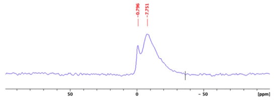 Since Na was the major impurity element present in the lignin, 23Na MAS NMR analysis on kraft lignin was performed to understand its chemical nature. The NMR spectrum shown in Figure 5 has two signals, one sharp signal at −0.796 ppm and a broad signal at −7.75 ppm. The broad signal at −7.75 ppm with no quadrupolar pattern indicates the absence of well-crystallized Na []. Hence, this signal can arise from a situation where the Na+ ions are not present in a well-defined crystalline structure or, more specifically, as a one-site ionic form similar to that observed in dehydrated Na-zeolites [] and Na exchanged sulfonated polystyrenes []. The isotropic line shape close to 0 ppm (at −0.796 ppm) was due to Na in a cubic symmetry. Since Na2S has a cubic crystal structure, the NaOH crystals are of orthorhombic symmetry, and the Na2SO4 crystals are of orthorhombic (anhydrous) and monoclinic (hydrated) symmetries, this signal can be assigned to the residual Na2S left on the lignin from the kraft pulping process.