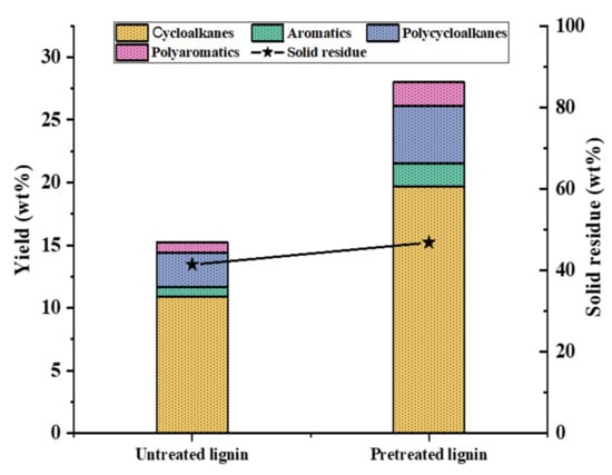 Product yield and solid residue obtained with untreated and pretreated lignins over the NiMoS/Al2O3 catalyst.