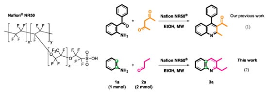 Chan, C.-K.; Lai, C.-Y.; Wang, C.-C. Environmentally Friendly Nafion-Catalyzed Synthesis of Substituted 2-Ethyl-3-Methylquinolines from Aniline and Propionaldehyde under Microwave Irradiation. Catalysts 2021, 11, 877. https://doi.org/10.3390/catal11080877