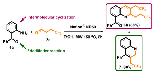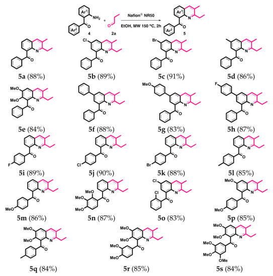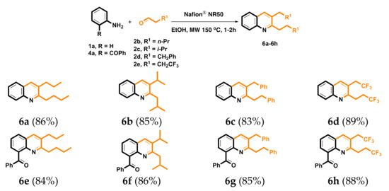 - Chan, C.-K.; Lai, C.-Y.; Wang, C.-C. Environmentally Friendly Nafion-Mediated Friedländer Quinoline Synthesis under Microwave Irradiation: Application to One-Pot Synthesis of Substituted Quinolinyl Chalcones. Synthesis 2020, 52, 1779–1794. [Google Scholar] [CrossRef]