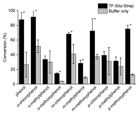 Graph of percentage conversions of phenols to the corresponding silyl ethers after 72 h. The error bars indicate standard deviations. A one-tailed Student’s t-test assuming unequal variance was performed, comparing each enzyme to its control. Comparisons resulting in a p < 0.05 were deemed to be significant and are marked with *.