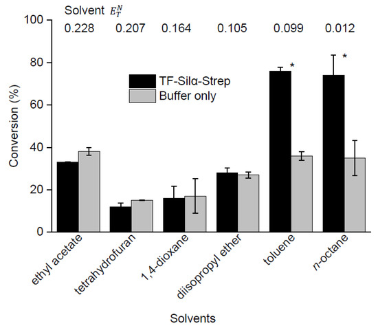 The current procedure for silyl ether condensation with Silα is based on previous work that utilises octane as the reaction medium [20]. However, this solvent greatly limits the range of substrates that can be applied, due to their low solubility. Thus, we tested a selection of solvents in an attempt to address this shortcoming. Several polar solvents were chosen (ethyl acetate, tetrahydrofuran, 1,4-dioxane and diisopropyl ether) and toluene was used as a model aromatic solvent. m-Methoxyphenol was chosen as the substrate, as the above results showed a moderate conversion, allowing for leeway to demonstrate both increases and decreases in conversion. As before, the reactions were carried out using lyophilised enzyme at 75 °C and analysed by GC-MS after 72 h. In line with earlier results, some silyl ether product was formed in all cases, even when the enzyme was omitted (Figure 3, Table S2 in Supplementary Information). Increased conversions above that of the control reactions were observed with the nonpolar solvents n-octane and toluene, with both giving similar net and gross conversions. In contrast, no net conversion was observed in any of the polar solvents.