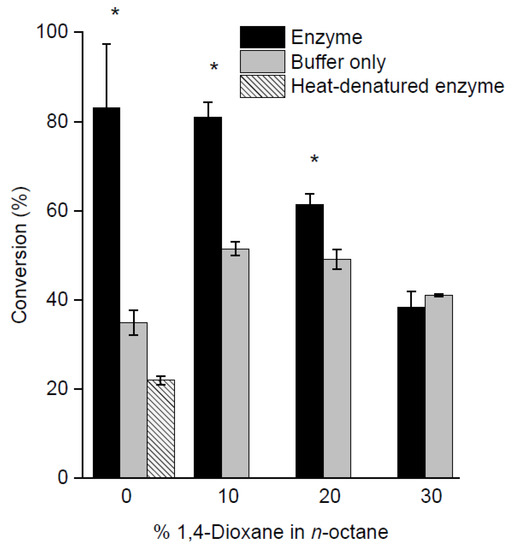 As attempts to increase the polarity of the reaction media with a single solvent were unsatisfactory, mixtures containing increasing proportions of 1,4-dioxane in n-octane were assessed. 1,4-Dioxane was selected due to its lower polarity (and is therefore less likely to remove the aqueous monolayer) and boiling point (101 °C) that more closely matches that of n-octane. In general, the net conversion fell with increasing proportions of polar solvent (Figure 4, Table S3 in Supplementary Information). Reactions with 30% 1,4-dioxane gave no statistically significant difference between the enzyme and control conversions, presumably due to the removal of structural water crucial to enzyme function, as mentioned above.