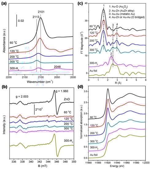 (a) In situ DRIFT spectra of adsorbed CO on Au/ZnO-nanorod catalysts; (b) EPR spectra of Au/ZnO-nanorod catalysts; (c) Fourier transform of k3-weighted EXAFS spectra (without phase correction) and (d) normalized XANES spectra at the Au LIII-edge of 20Au/ZnO-nanorod catalyst. The catalysts were calcinedat 60, 120, 200, and 300 °C and then reduced at 300 °C. Reproduced with permission from [44], copyright: 2012 by the American Chemical Society.