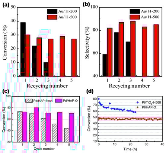 (a) Conversion and (b) selectivity of benzyl alcohol over Au/H-200 and Au/H-500. Reproduced with permission from [45], copyright: 2016 by the American Chemical Society. (c) Cycling performance of Pd/HAP-fresh and Pd/HAP-O for the Suzuki cross-coupling reaction. (d) CO conversion versus reaction time of Pt/HAP-O and Pt/TiO2-H500 samples at 400 °C. Space velocity of Pt/HAP-O and Pt/TiO2-H500 were ~1,690,000 and 1,100,000 L gPt−1 h−1, respectively. Reproduced with permission from [46], copyright: 2018 by The Royal Society of Chemistry.
