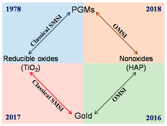 A breakthrough came from Mou’s group in 2012 [44]. They found an oxygen-induced SMSI phenomenon in an Au/ZnO-nanorod catalyst, that, following oxidation under 300 °C, the Au nanoparticles will be encapsulated by ZnO accompanied by electron transfer from Au to the support, which will be reversed by hydrogen treatment. This work, for the first time, not only extended the conditions for evoking SMSI but also opened a prelude for the study of SMSI in Au-based catalysts. Only about four years later, a similar oxidative SMSI phenomenon was revealed by Tang et al. in nonoxide (hydroxyapatite and phosphate)-supported Au catalysts, expanding the territory of SMSI to the non-oxide support system [45]. Furthermore, in 2018 [46], they confirmed that the nonoxide- and ZnO-supported Pt-group metals are also applicable for this oxygen-induced SMSI, and formally proposed the concept of “oxidative strong metal–support interactions (OMSI)” to distinguish from classical SMSI, which was triggered by reductive conditions. It has been proved that controlled OMSI is effective in tuning the catalyst performances [44,45,46,47], and a few discoveries inspired by OMSI were consecutively reported thereafter, such as uncovering the classical SMSI between Au (actually the IB group metals) and TiO2, and SMSI between Au and layered double hydroxide support [48,49].