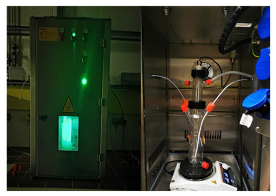 Figure 1 shows the photocatalytic experiments that were conducted in a jacketed glass reactor (working volume 225 mL) (Peschl Ultraviolet GmbH, Mainz, Germany) with a safety cabinet. The reactor was irradiated from inside using a custom-made LED immersion lamp; the LED has maximum emission at 430 nm. Glass reactor was then sonicated with a reaction mixture for uniform dispersion, followed by stirring with continuous airflow to maintain adsorption–desorption equilibrium for 30 min. Subsequently, lights were turned on, which is considered as zero time (to). Nine to ten samples (1 mL) were periodically collected from the reaction mixture. After centrifugation and filtration, the samples were analyzed using HPLC. For acidic and basic reaction conditions, the pH of the mixture was adjusted using 0.1 M HCl and NaOH. The phenol degradation efficiency was determined using the following Equation: