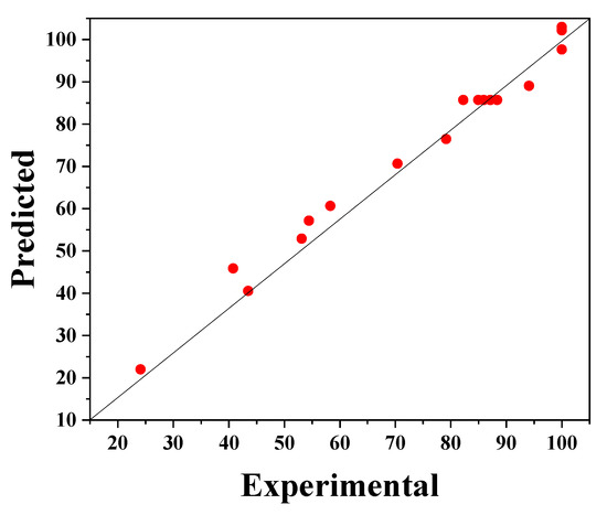 Equation (2) provides a suitable relationship (R2 = 0.810) between the response (degradation efficiency) and the parameters, which can be seen in Figure 6. In this figure, the experimental values of phenol degradation are plotted against the predicted values obtained from the RSM model; these values of the percentage phenol degradation fit well.