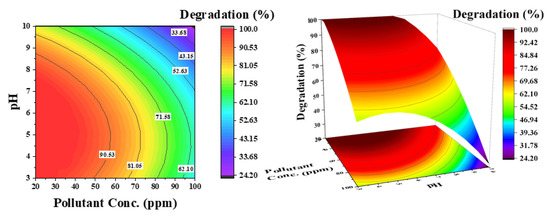 Figure 9 shows the effect of catalyst concentration and pollutant concentration at a constant pH of 6.5. The contour lines demonstrate that both parameters independently affect the degradation efficiency. By increasing the catalyst concentration at a lower pollutant concentration, phenol degradation increases; however, at a higher pollutant concentration, the degradation efficiency decreases. This can be attributed to the availability of active sites on the catalyst surface for OH− radicals, as well as phenol molecules. The electron–hole pair generated from the catalyst surface improves the degradation rate.