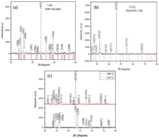 The EDS spectra of both copper sulfides (Figure 2c,d) demonstrated that they mainly comprise Cu and S elements. The weight % of Cu and S estimated for both covellite and digenite phases are shown as tables in the inset of the respective EDX spectrum. Ideally, the weight % of Cu and S in covellite should be 66.46/33.54%. The table shows that the estimated values were quite close to the ideal values, with the percentage of Cu being slightly higher than the expected value, similar to an earlier report. This higher percentage of Cu could be attributed to the excessive absorption of copper ions on the surface of nanoparticles [52]. The ideal amount of Cu/S in the digenite phases is 78.10/21.90%, and the EDX spectrum showed the presence of an O atom, which was due to the generation of SO2 as a byproduct of the oxidation of CuS into Cu9S5 [53]. The structural evolution of Cu9S5 nanosheets from CuS nanoflowers was reported at 250 °C, with the generation of SO2 as a byproduct [54].