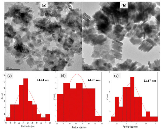The TEM micrographs presented in Figure 3a,b conform with the observation in the SEM micrographs. It is apparent that both samples were distinctly different in their morphologies. The covellite CuS in Figure 3a shows a cluster of spherical nanoparticles with an average particle size of 24.24 nm, while the digenite Cu9S5 presents some stacks of nanorods oriented parallel and with an average length and width of 61.25 and 22.71 nm, respectively, as shown in their particle size distribution histograms in Figure 3c,d, respectively.