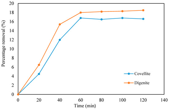 The dark adsorption experiment was conducted prior to photodegradation by stirring the mixture of the prepared samples with the TC solution in the dark in order to attain the dark adsorption–desorption equilibrium. The results presented in Figure 6 showed that an adsorption equilibrium was reached between the TC solution and the catalyst after 60 min when the samples were taken at 20 min intervals. In addition, the results indicated that less than 20% degradation efficiency of the TC was achieved in the dark adsorption experiment for digenite, while 15% was achieved using covellite as a photocatalyst. Additionally, the adsorption process did not show a significant effect on tetracycline degradation, indicating that dual activities or the mechanism of adsorption and degradation would be required for the total removal of TC from aqueous solution. The adsorption performance of digenite was higher than covellite, similar to previous studies on the degradation of TC [74].