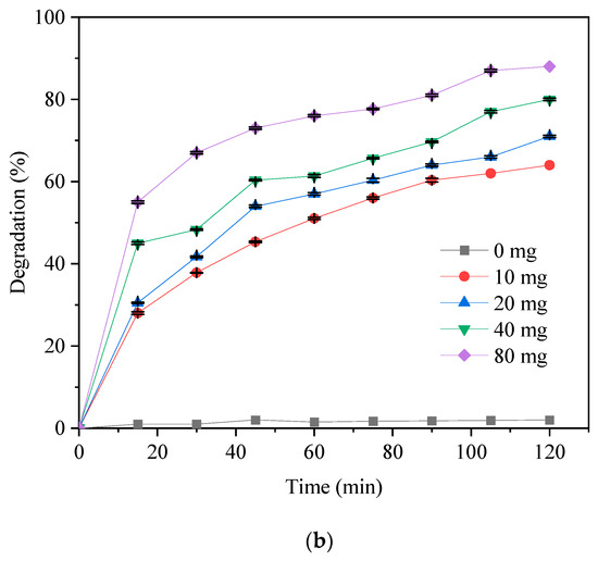 The amount of catalyst used in a degradation experiment has a significant effect on the efficiency of the degradation. The degradation study of TC solution was conducted with and without a photocatalyst under visible light in order to establish the role of the photocatalysts. The results presented in Figure 8a,b indicate that little or no degradation of TC occurred prior to the introduction of photocatalyst in both cases. About 5% degradation occurred in the absence of the catalyst after 120 min under visible light. The sharp increase in degradation only started after the introduction of digenite and covellite into the system. The degradation efficiency of TC increased with the catalyst loading up to 200 mg/L, implying a direct relationship between the catalyst loading and the percentage degradation. In addition, photoresponse due to adsorptive degradation is a predominant mechanism for TC removal using both catalysts. Therefore, enhanced degradation achieved with an increase in catalyst loading could be attributed to the increase in the number of active sorption or catalytic sites available on the surface of these catalysts. However, excess catalyst loading above the optimum dosage might cause the scattering of light and a screening effect, which might lead to a reduction in the specific activities of the photocatalysts. A degradation efficiency of 98.5% (Figure 8a) was obtained for digenite using 200 mg loading after 120 min, while only 88% (Figure 8b) was achieved for covellite using the same operating condition. This could be attributed to both the difference in their band gap energy and visible-light absorption property. The oxidative potential of materials reduces with a decrease in the band gap energy, and this may impact the photocatalytic potency of materials [75]. Both digenite and covellite exhibited comparable and highly competitive percentage degradation for TC in the first 110 min of exposure to light. Although covellite has a lower degradation ability owing to less absorption intensity under visible light compared to digenite, more than 80% degradation was achieved after 120 min, which showed that the covellite phase also has good photocatalytic behavior. Nagami et al. [76] studied the photocatalytic degradation of TC using cadmium sulfide nanocomposite (CdS/NC-T). About 83% degradation efficiency was obtained with an initial tetracycline concentration of 50 mg/L. Compared to our result, digenite and covellite could be better candidates for the complete removal of TC from water.